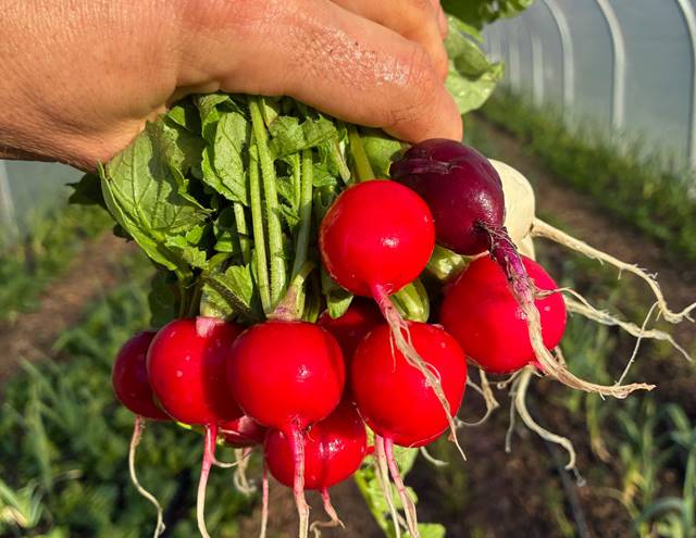 One unexpected highlight has been the onions. We tried three types this year: Red Baron, Long Red Florence, and shallots. They were multi-sown through a weed membrane to suppress unwanted growth and hold moisture. By July, they were swelling beautifully. Some of them are monsters. The time to harvest is close when the green tops start to flop over. When we see this, we push all the tops over to help speed up the finishing process. A week later, we pulled them and laid them out in the sun for a few days before they were laid out on a stack of pallets in a barn that is cool, dark and dry. Where there’s now barely a square inch left unoccupied by onions. I’ve even had to leave a whole bed in the ground to dry naturally because we’ve run out of space. A problem I’m happy to have.