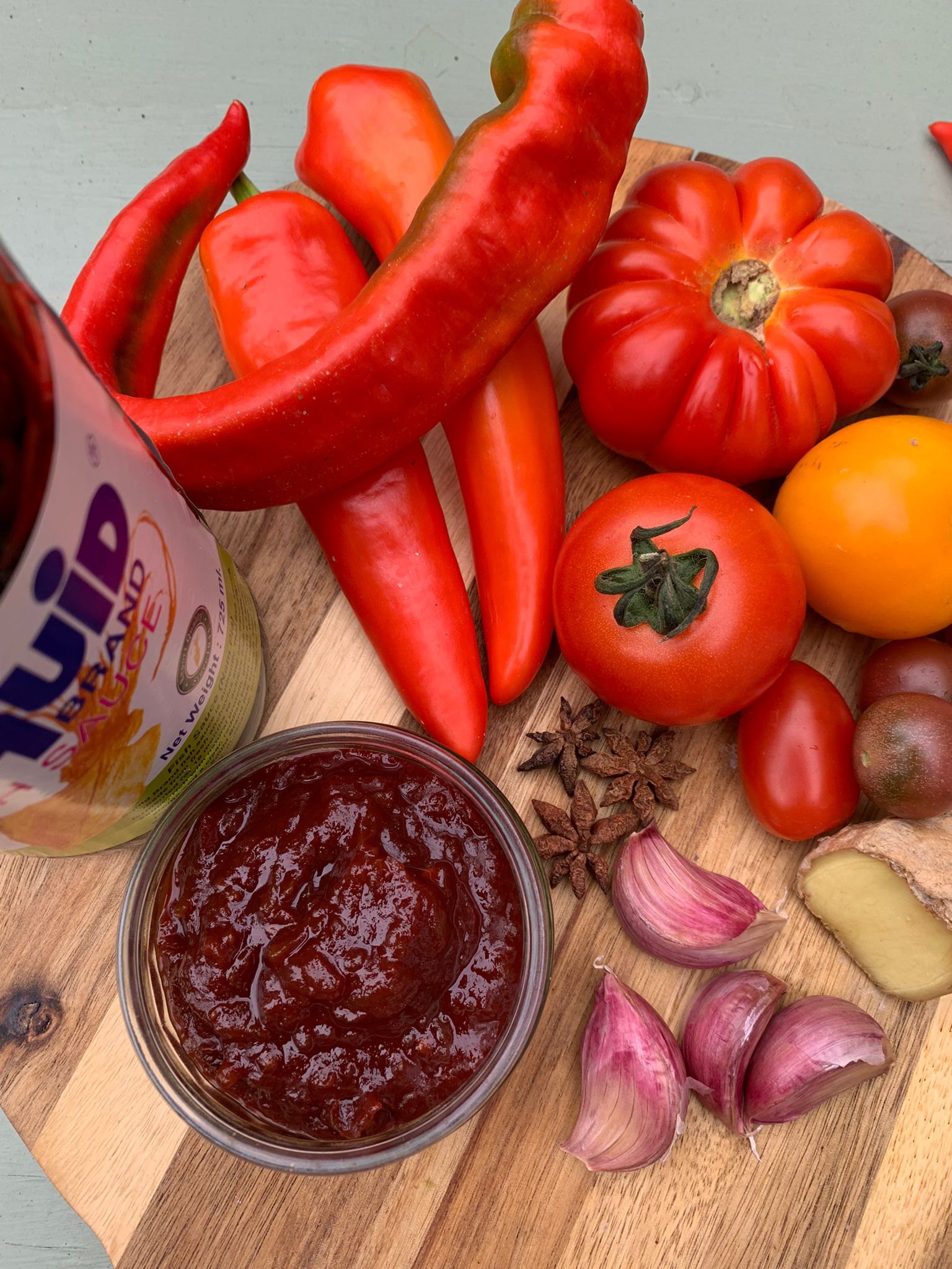 What you'll need: 5 mild red chillies roughly chopped, 4 large cloves garlic peeled and roughly chopped, 50g fresh ginger (peeled weight) roughly chopped, 3 star anise, 80ml fish sauce (nam-pla), 250g castor sugar, 150ml red wine vinegar, 2kg tomatoes chopped