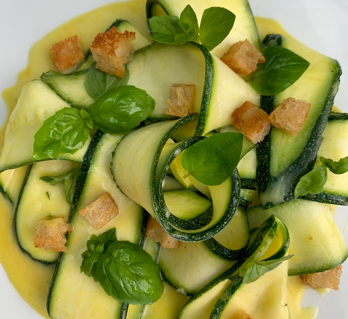 Method: Whisk all the ingredients for the dressing vigorously to emulsify. Slice the sourdough into neat cubes and sauté in a little rapeseed oil until toasted on the outside. With the pan hot, add the butter along with the whole clove of garlic and chopped rosemary. Let the butter foam until the croutons are golden and drain them off. In a bowl, gently mix the dressing with the courgettes, it should be thick enough to coat them. Assemble into a bowl and top with the crotons and some basil and oregano tips.