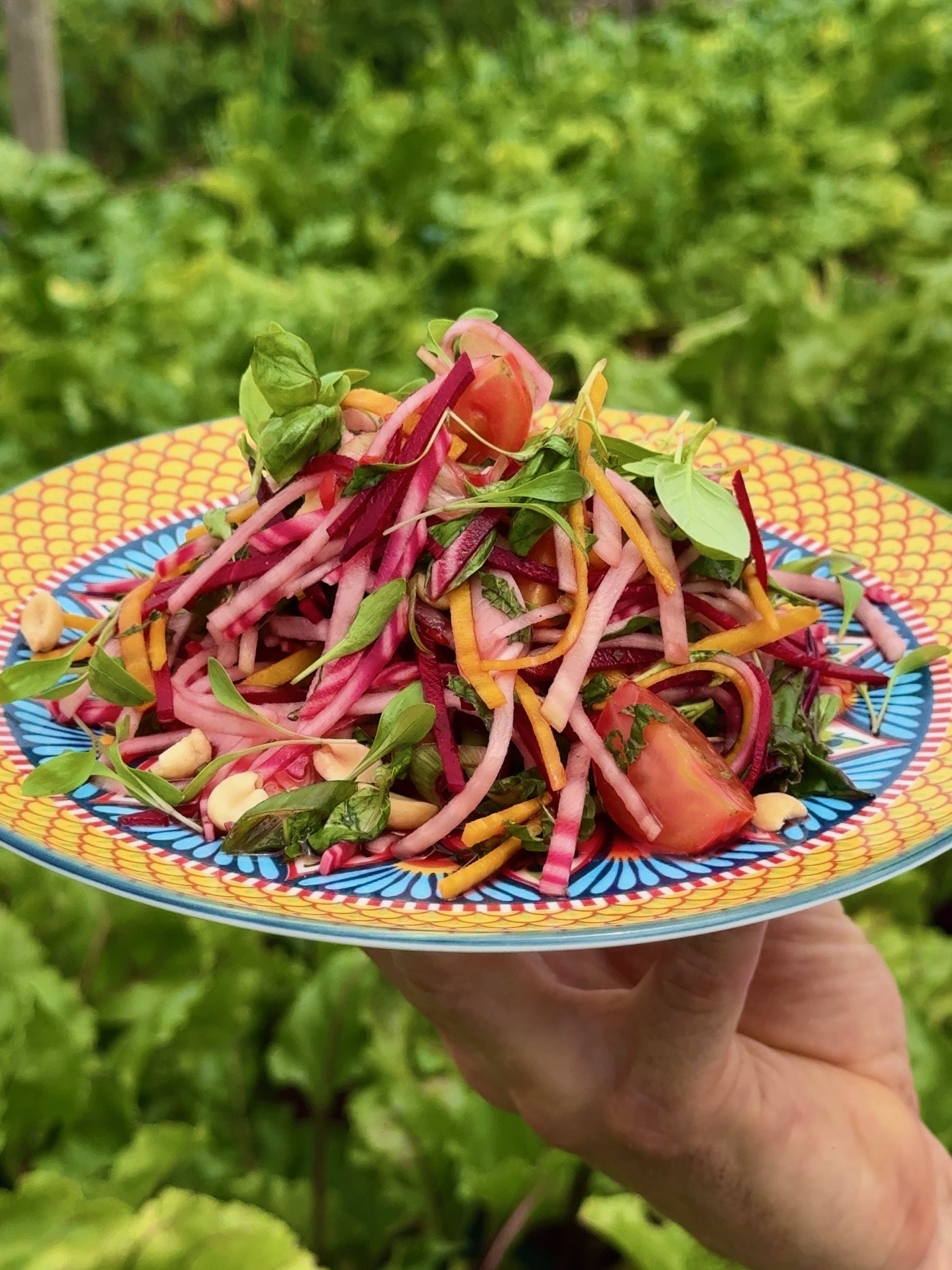 The flavours in this dish are a riff on those in the classic Thai green papaya salad: spicy, salty, tangy, and nutty. Something the beetroot holds up well to. We have loads of good-sized beetroot in 4 different colours. Larger beets make for easier slicing. I use a mandolin to get a nice even cut, but they could be grated.