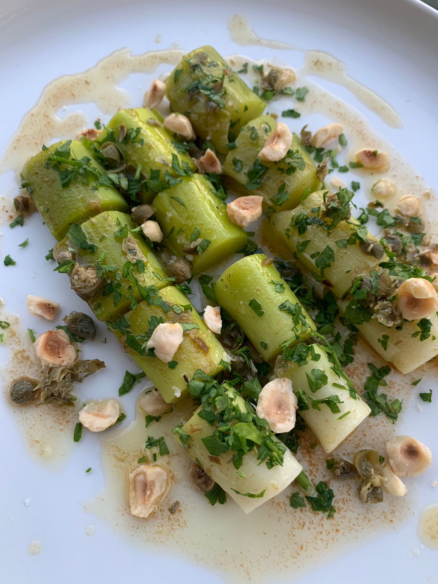 Mix the capers, hazelnuts and parsley into the brown butter and pour over the leeks.