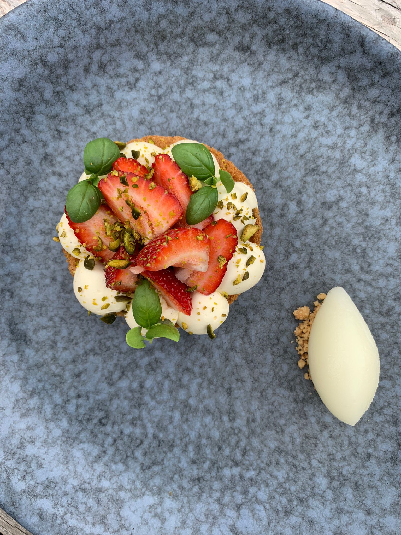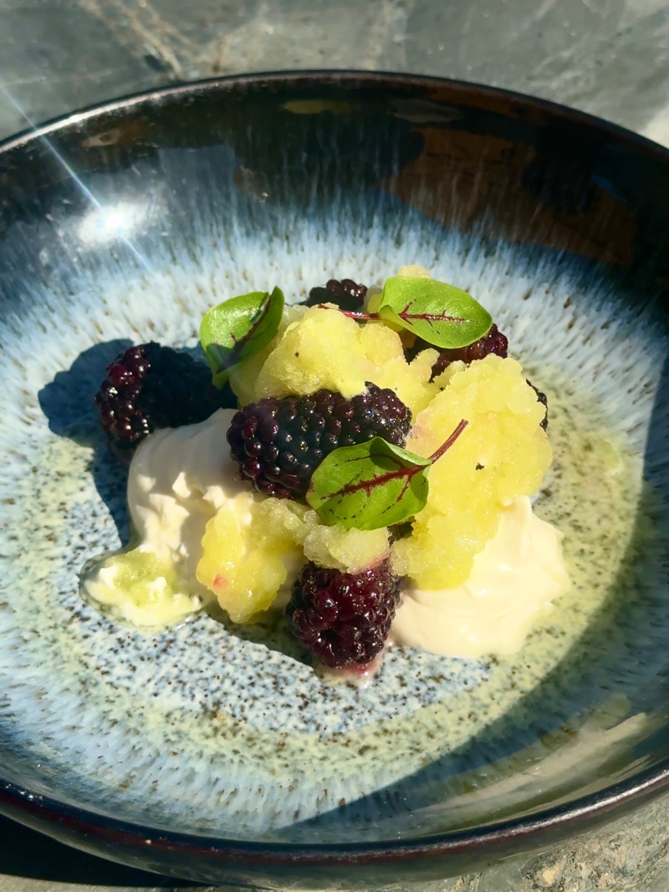 Blackberries with apple & mint granita and salted cream