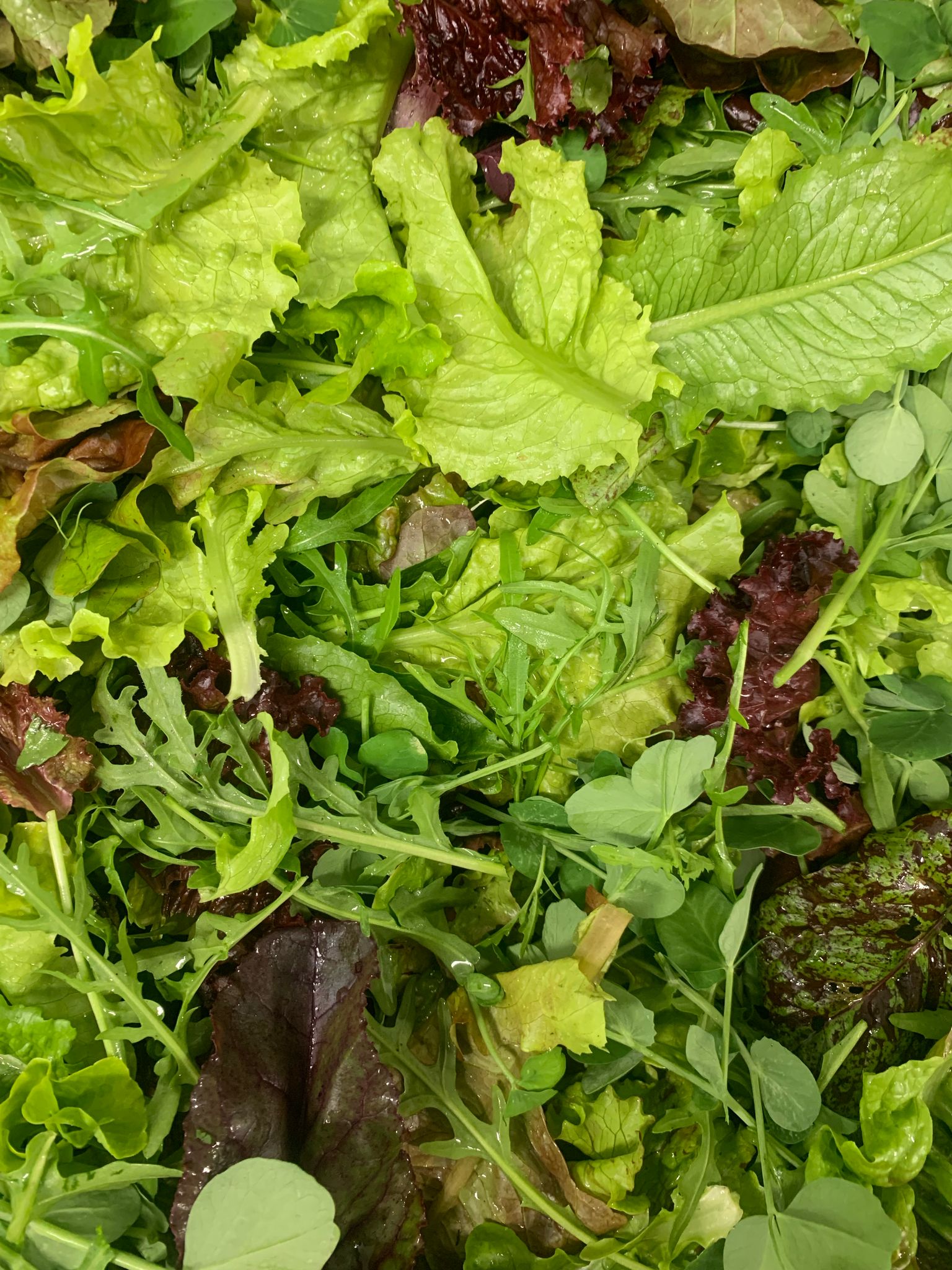 But for that luxurious mouthfeel, drizzle over the oil, thinking about what it may add or take away from the salad, depending on how bitter it may be. It's a bit of a balancing act. Toss again with one hand so the oil coats everything evenly. Salad-tossing utensils are no substitute for hands
