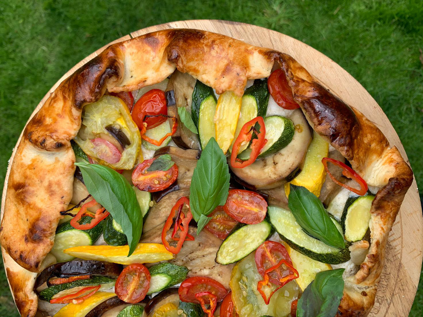 Place in the oven at 190 C and set a timer for 30mins, checking to make sure vegetables are soft and crust golden. Remove from the baking sheet and bake for another 15 minutes straight on the oven shelf to ensure the base is cooked. Serve right away or cooled. I’ve added fresh chilli and basil, also from our polytunnel.